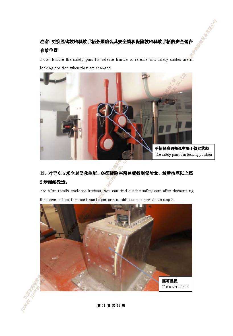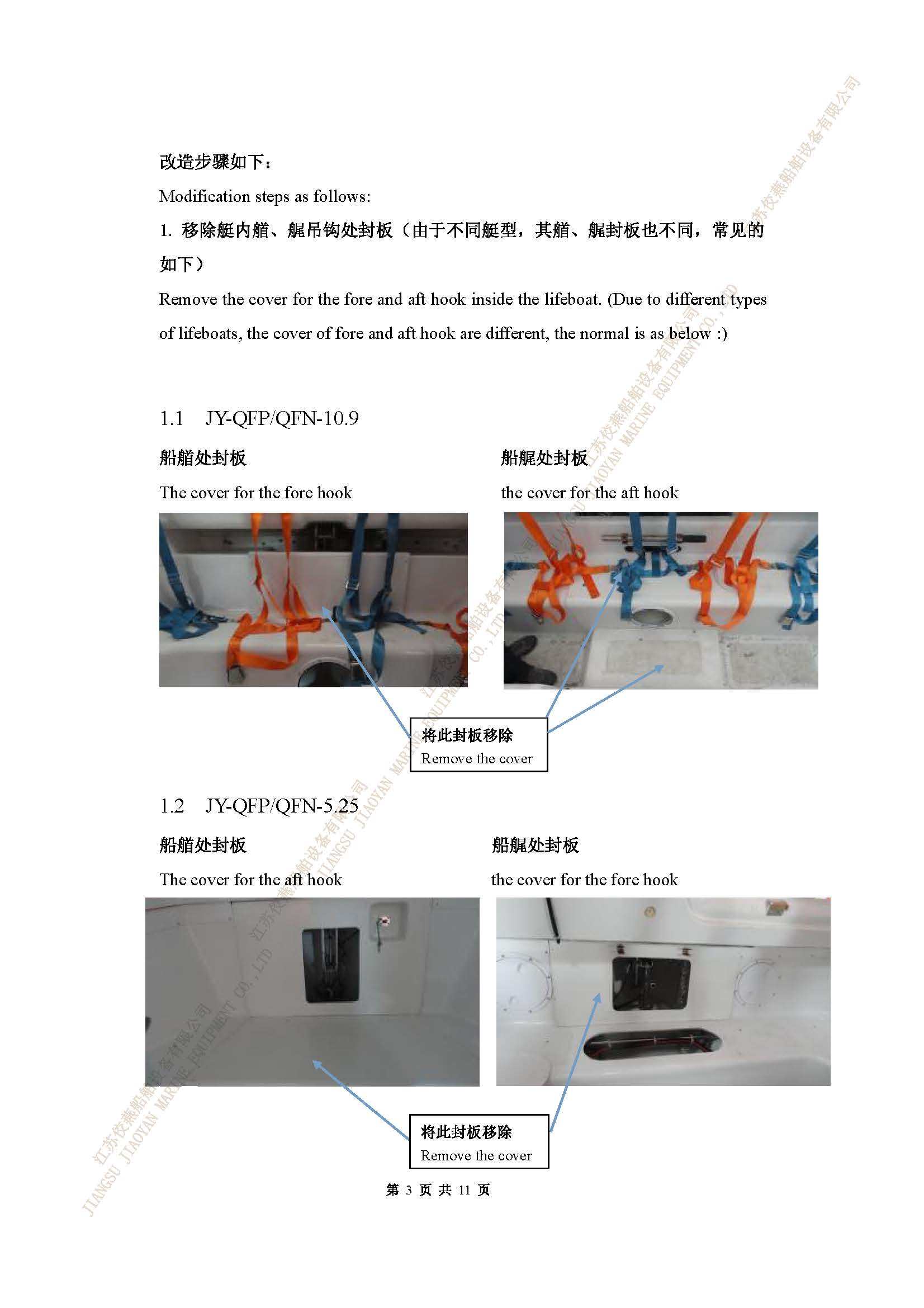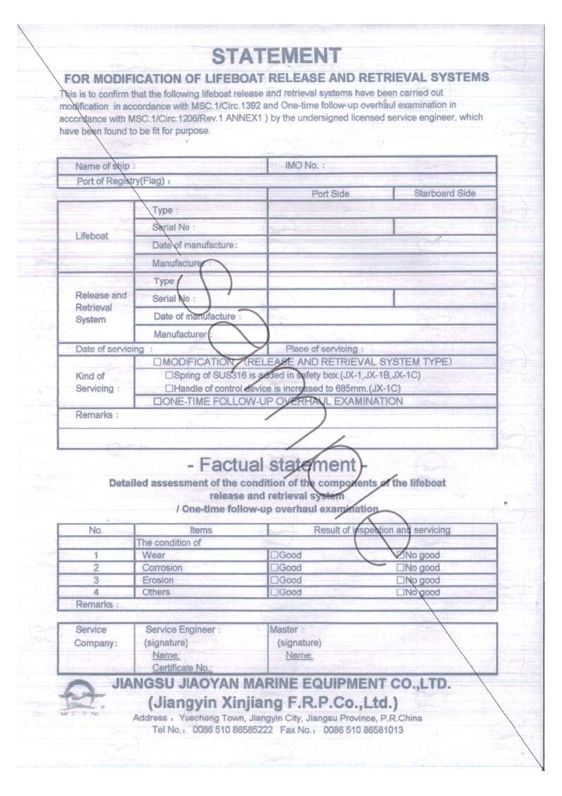 近期,发现国内存在一些服务公司为牟取私利,置船员生命安全于不顾,未经我公司专业培训和认可,擅自对我公司(星空(中国)船舶设备有限公司/江阴新江玻璃钢有限公司)生产的救生艇设备进行救生艇吊钩改造,同时签发伪造的声明,因此引起了重大的安全事故.重要提示:星空(中国)船舶设备有限公司(江阴新江玻璃钢有限公司)对一切未经本公司专业培训和认可的服务商提供的对本公司产品的所有服务不承担任何责任,并保留对其追究法律责任的权利.