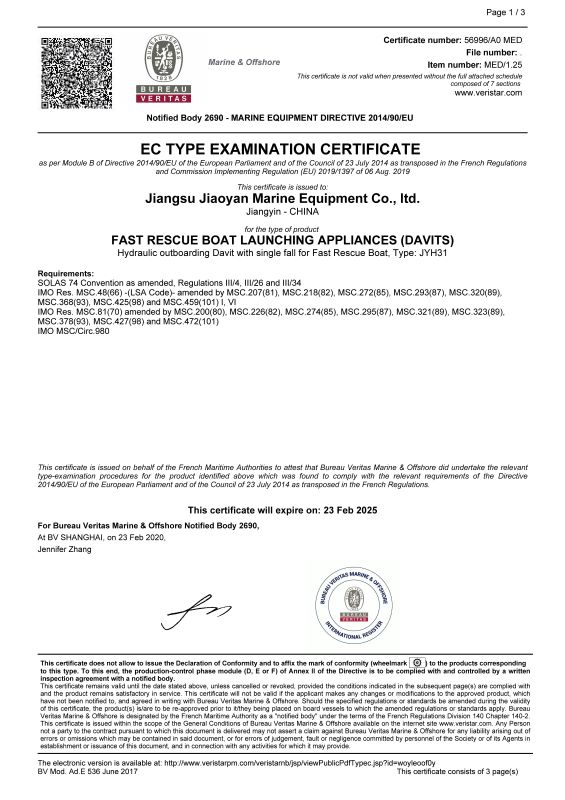 附件1:星空(中国)高速救助艇架 EC型式认可证书。